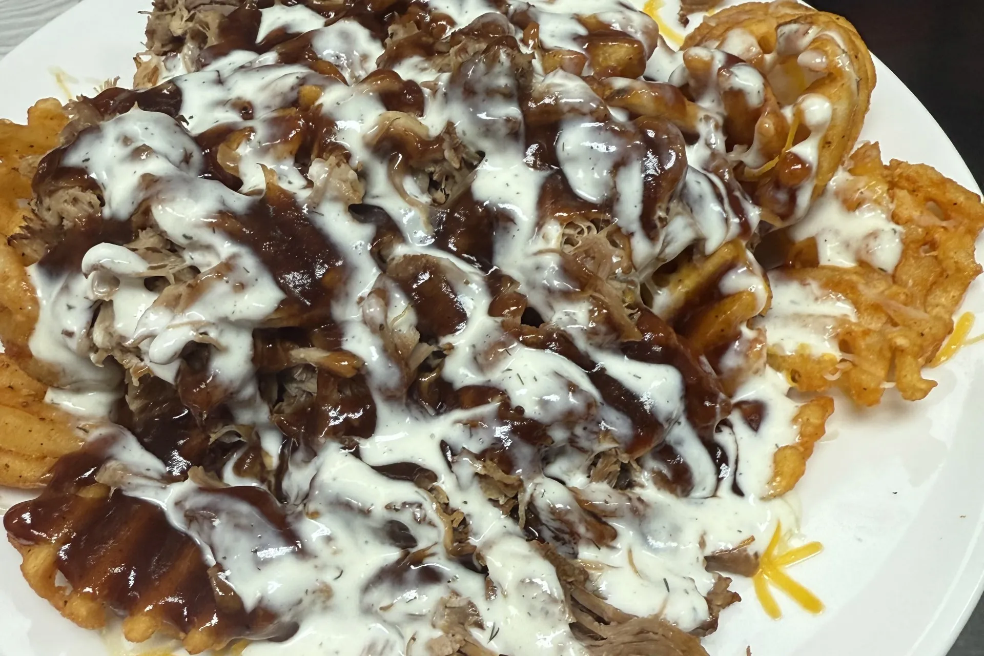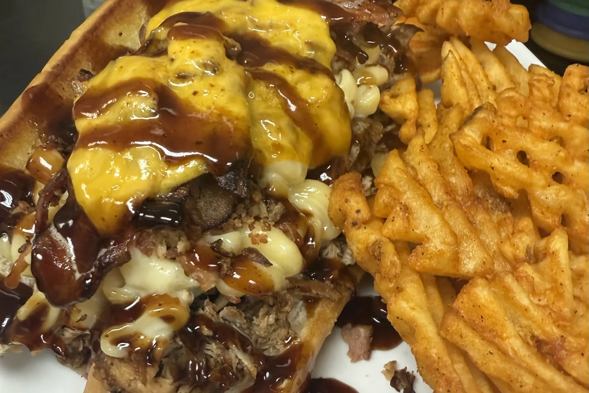 2 eggs any style, shredded cheese, sausage, and bacon on a bed of maple waffle bites topped with syrup on the side.