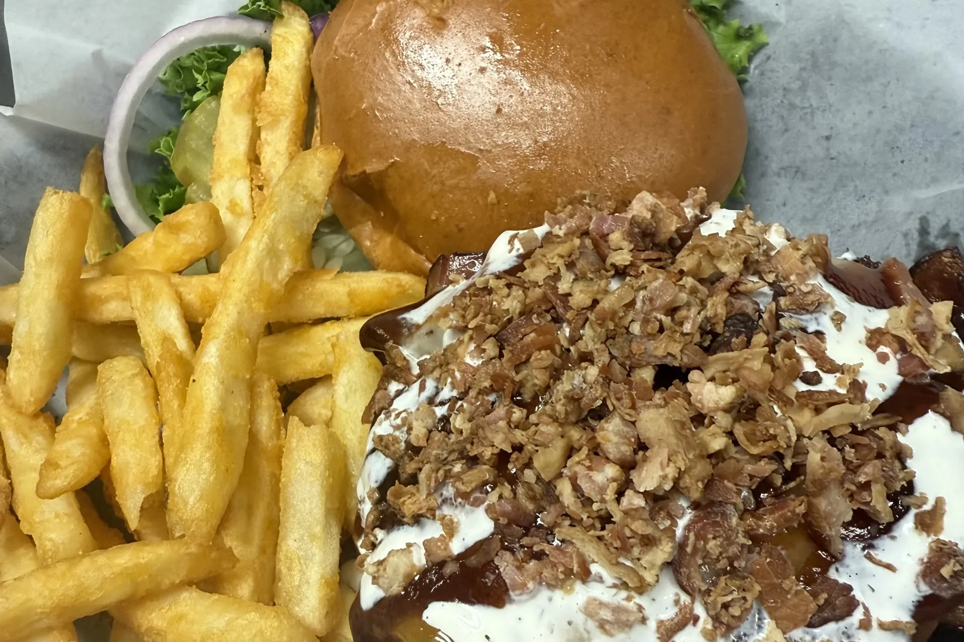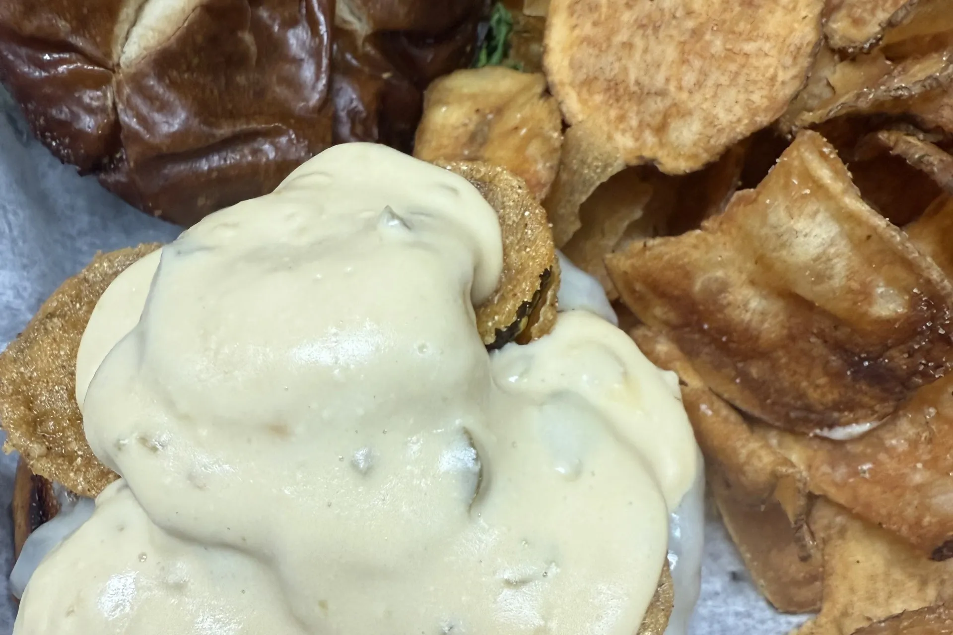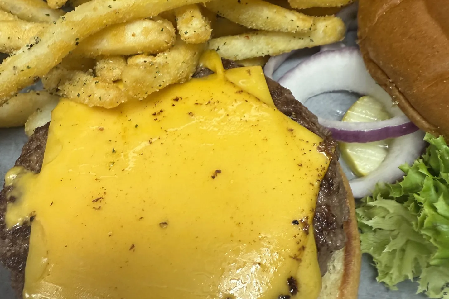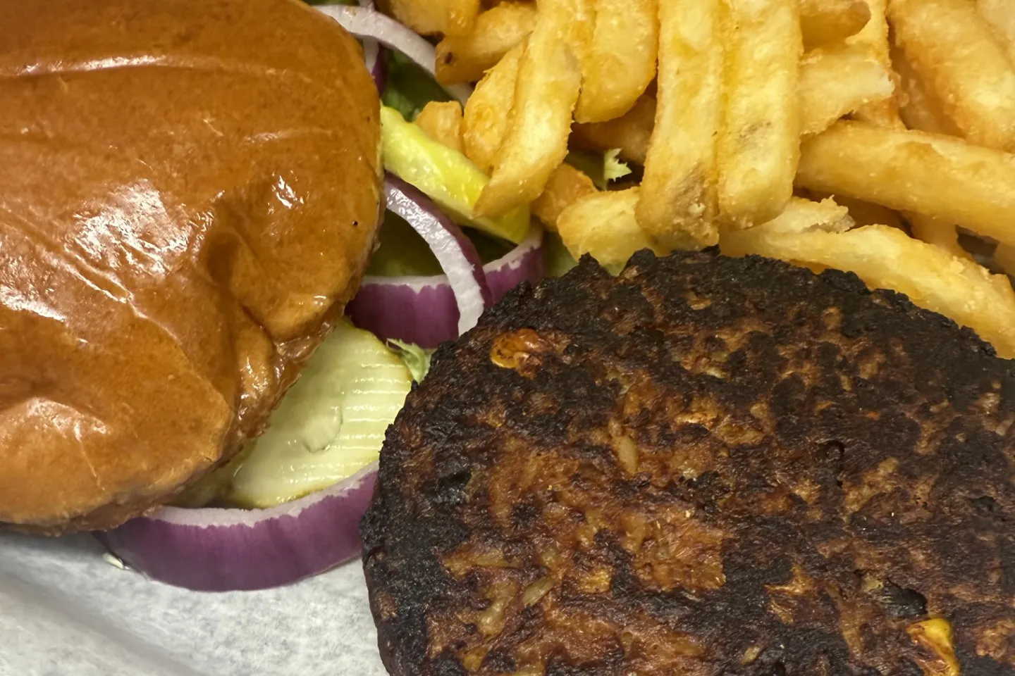 Fresh 1/3 lb. beef patties cooked your way, served with lettuce, onion & pickle on a brioche bun (unless noted) and our house made chips. Substitute to a Pretzel bun, add tomato, bacon, or an extra patty to make it a double. Substitute black bean or turkey burger for no additional charge. Upgrade your side.