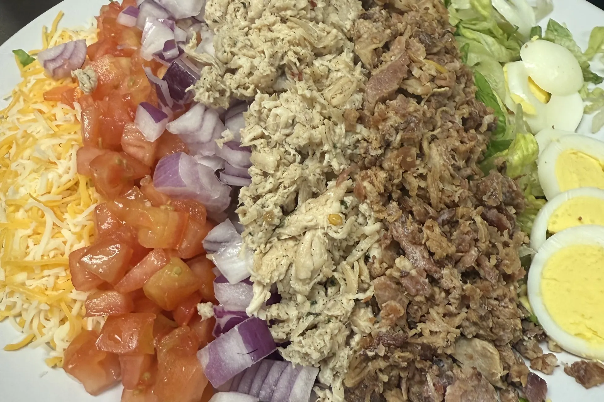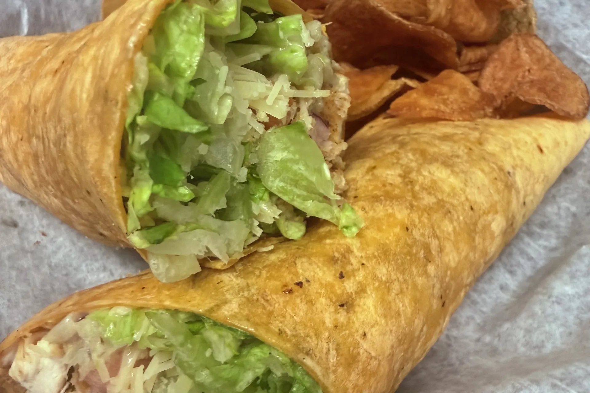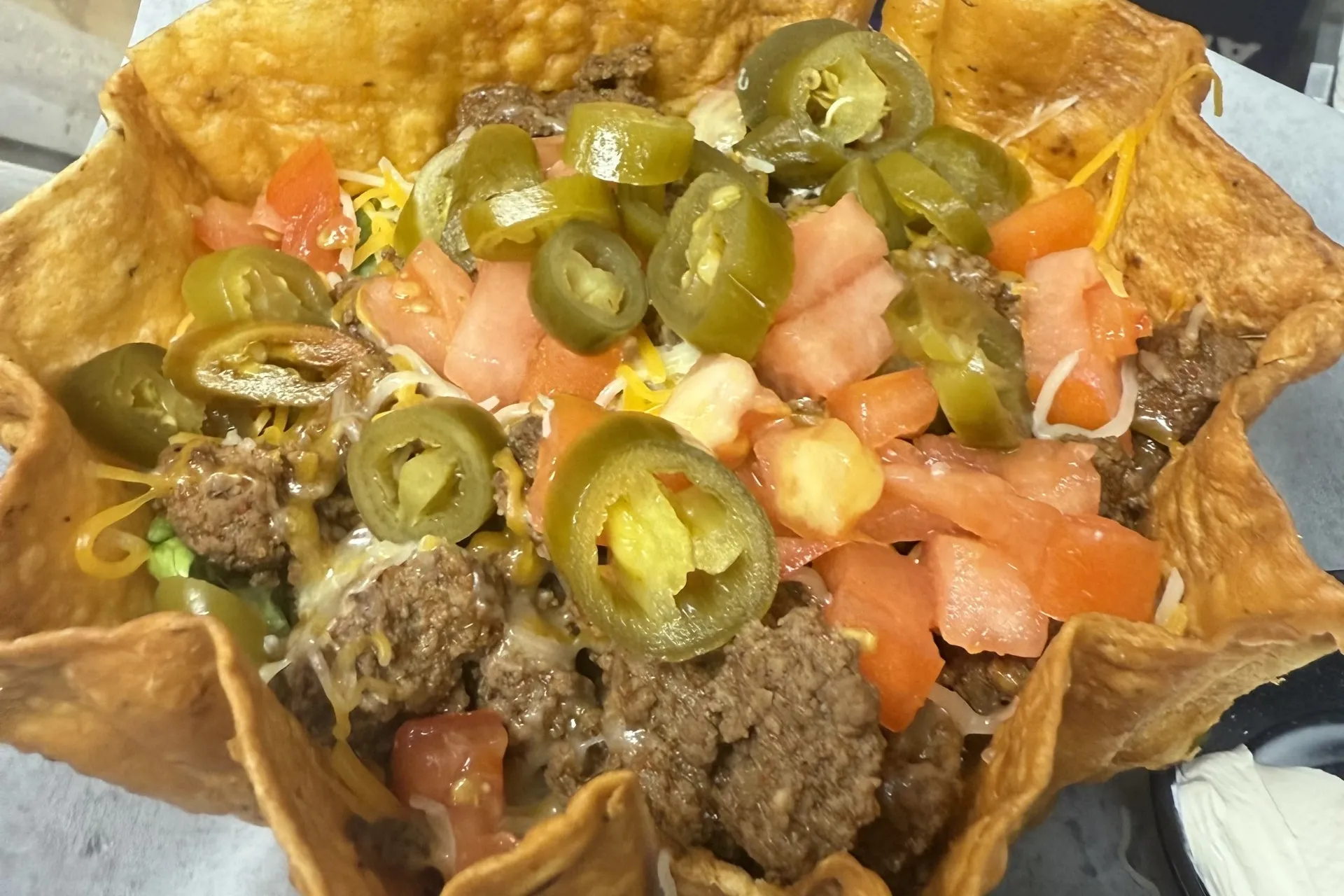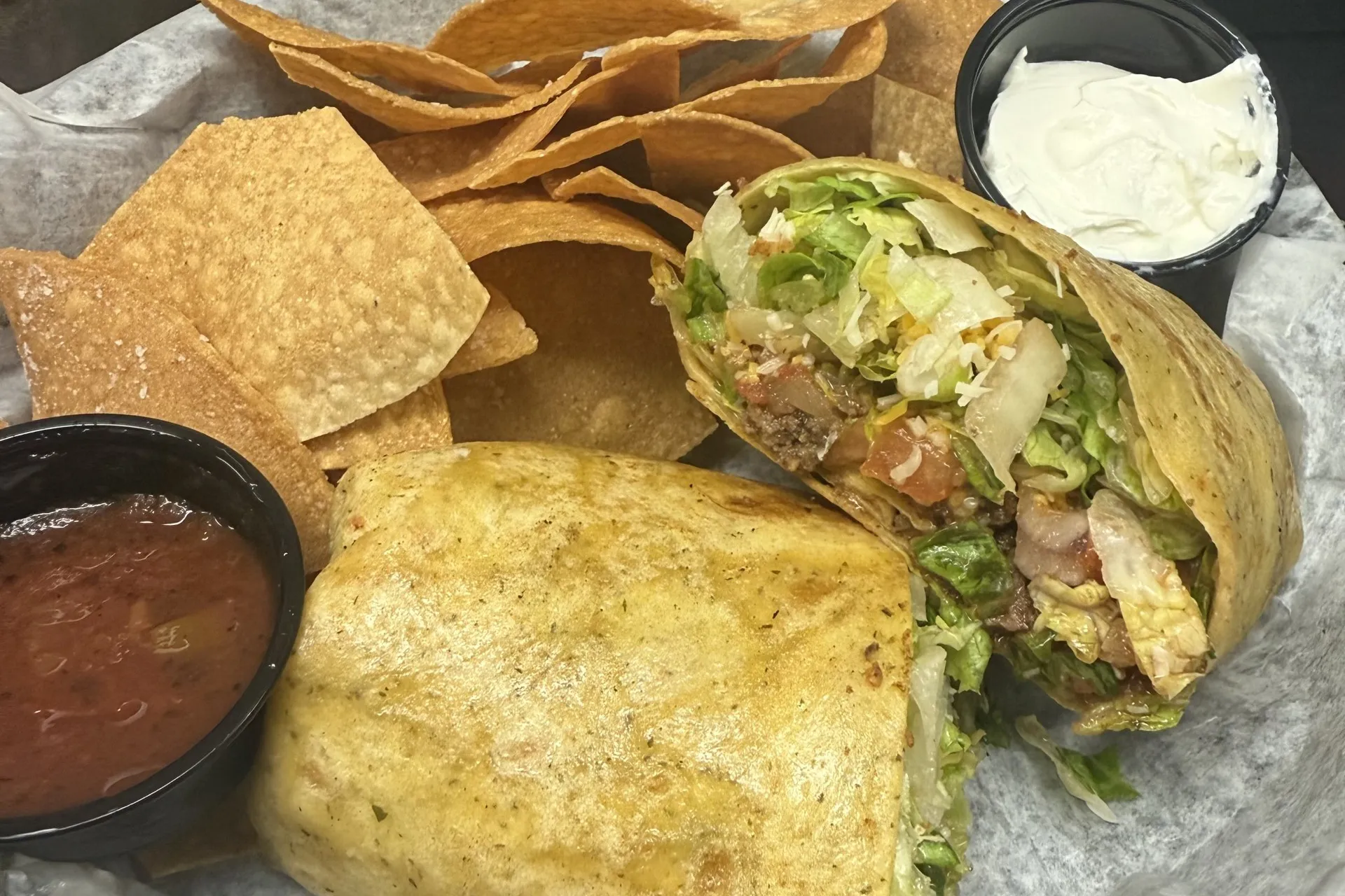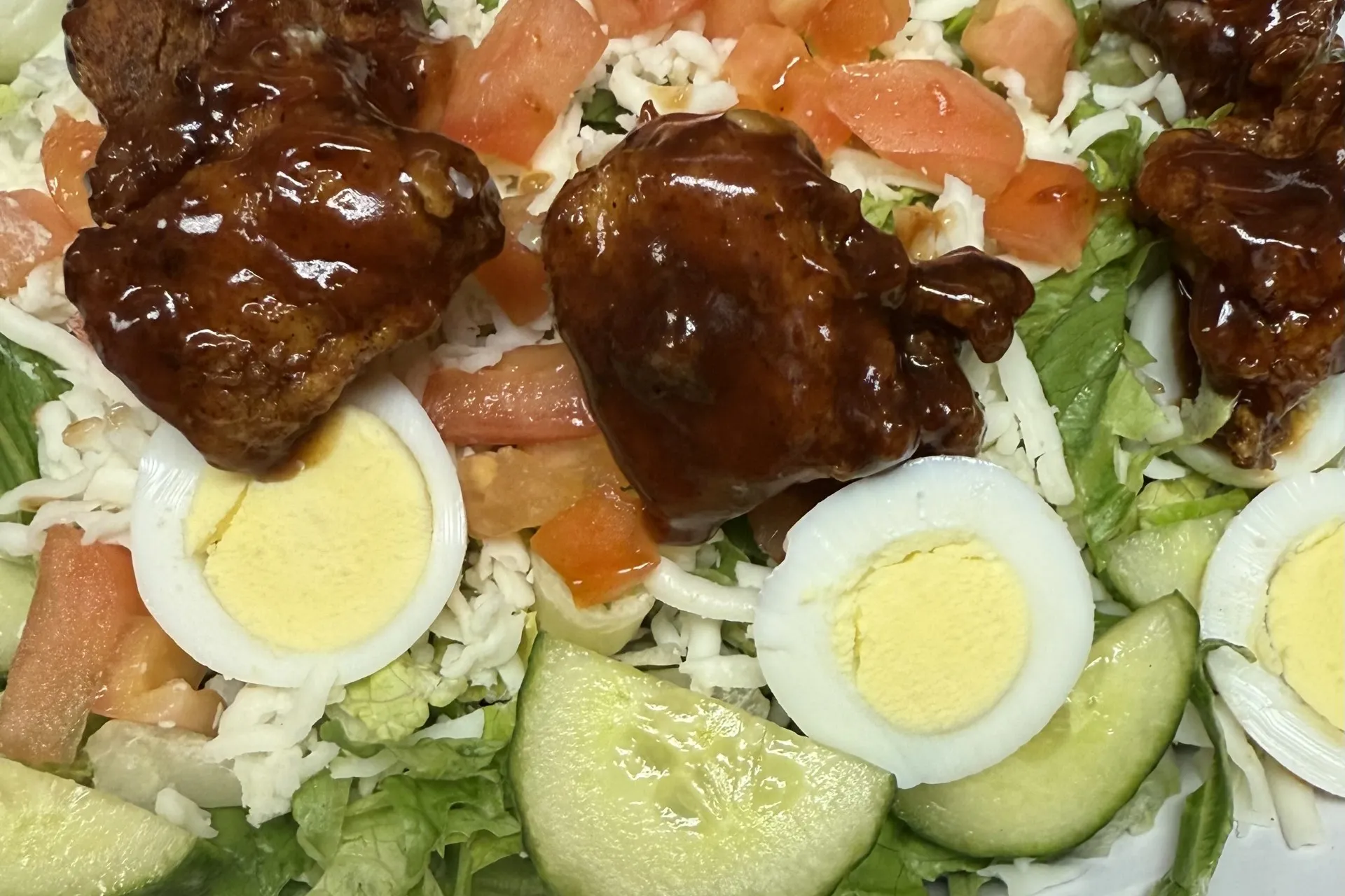 Lettuce, cheese, and roasted chicken. Substitute taco meat. Served with choice of side.