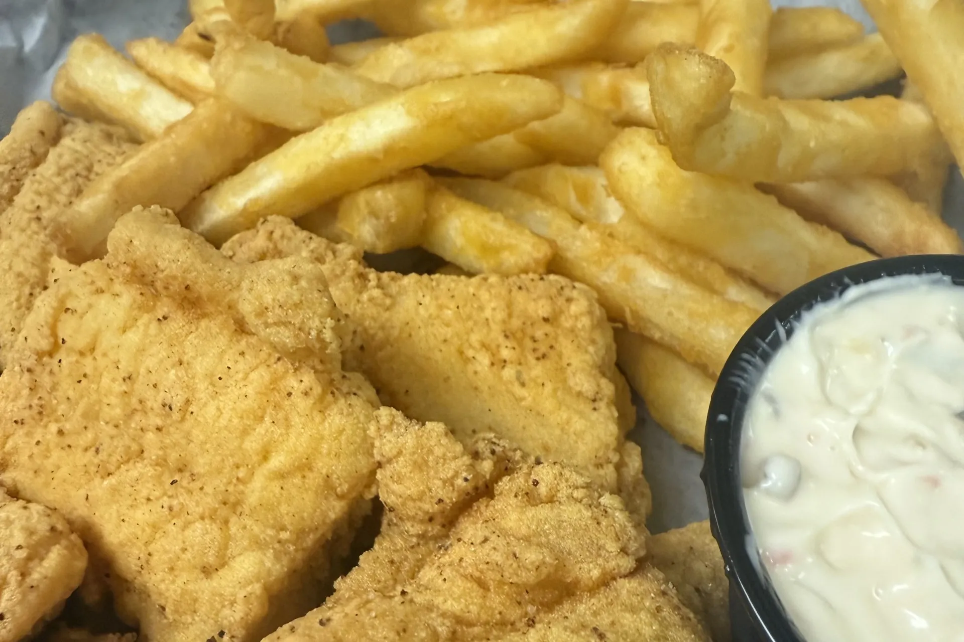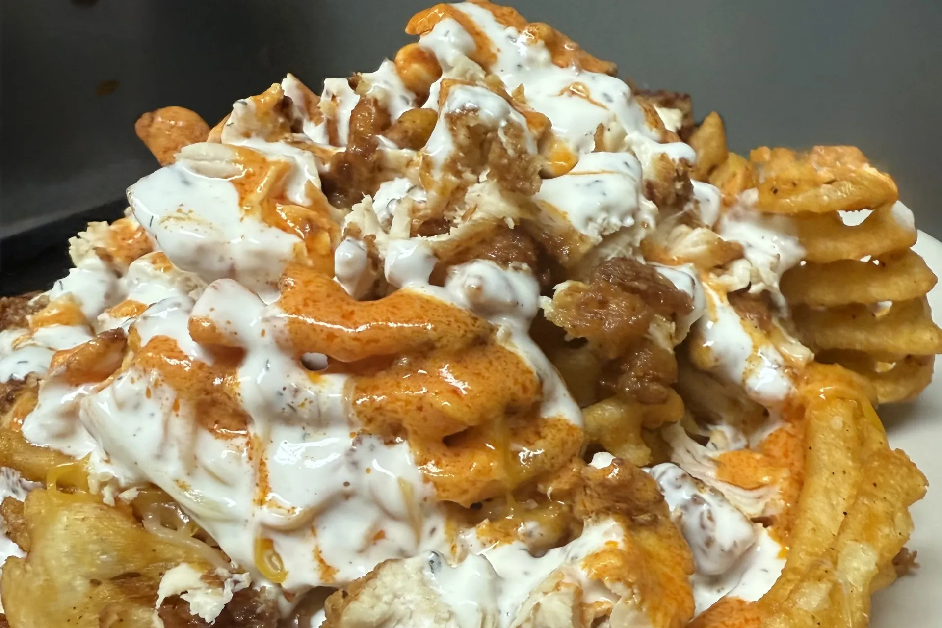 A bed of maple waffle potato bites layered with bacon, shredded cheese, fried chicken tenders, two eggs any styleand syrup on the side.