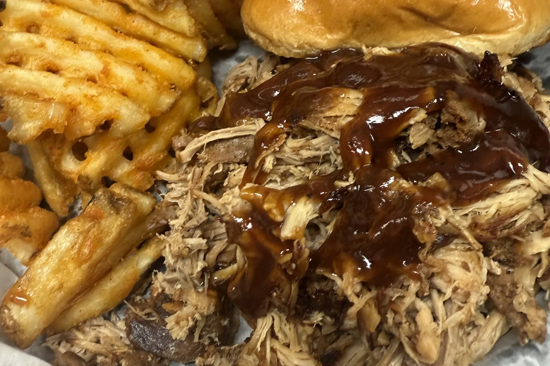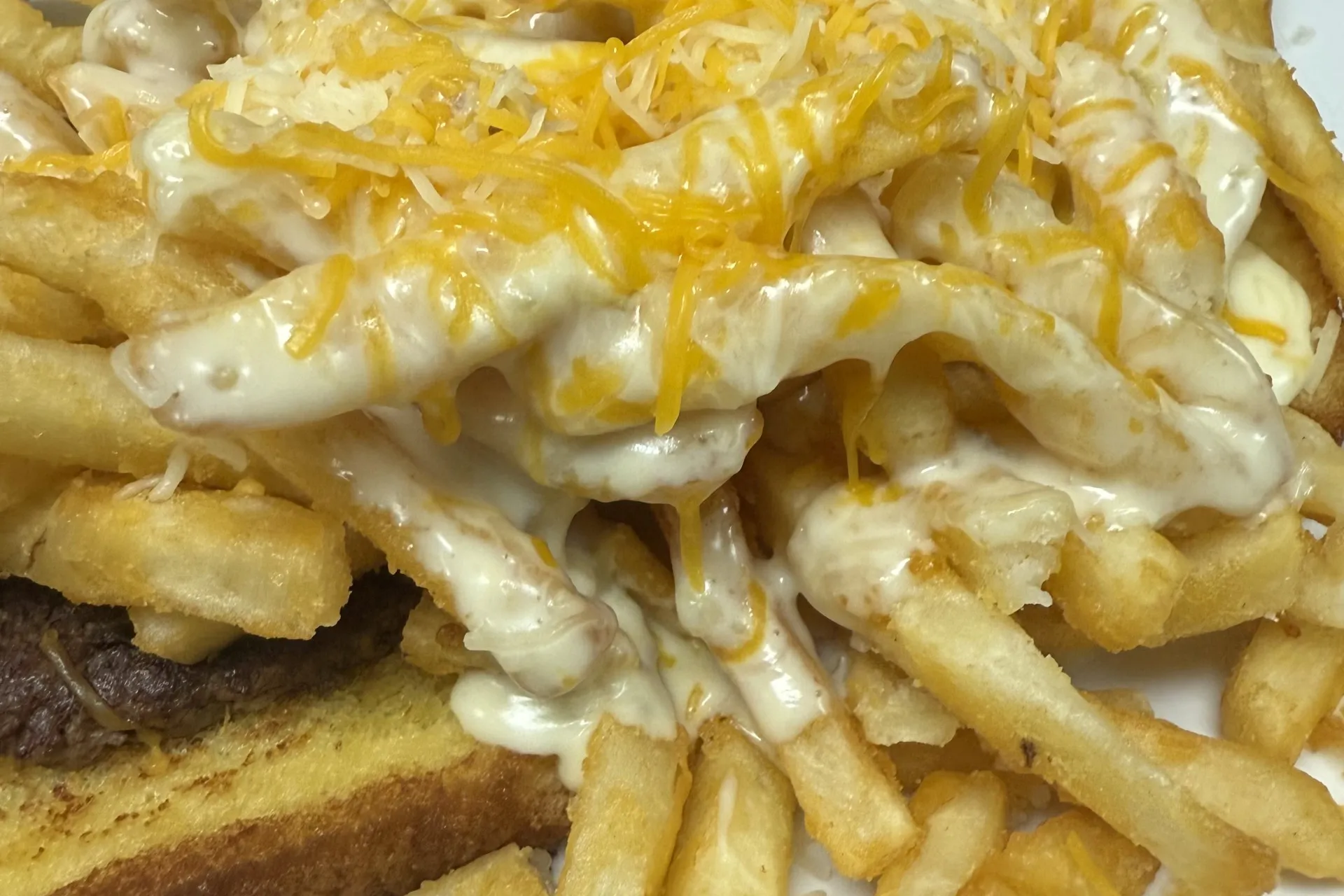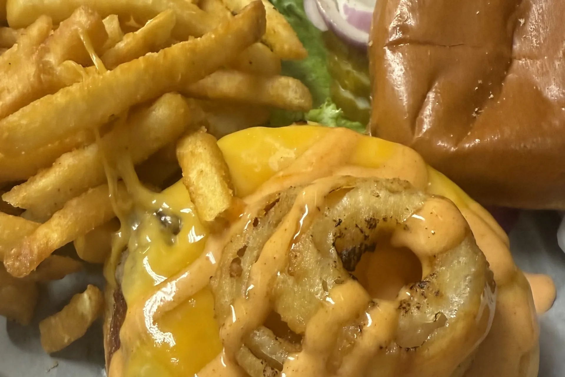 Two smashed patties, cheddar cheese, bacon, grilled onions, and pepper jam on Texas Toast.